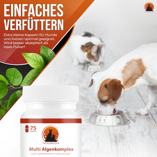 75 Kapseln Multi Algenkomplex für Hunde und Katzen mit natürlichem Algenpulver, Eisen, Vitamin C und Vitamin B. Geeignet für Tiere zur Eisen und Vitamin B und C Ergänzung nach Erkrankungen und Parasitenbefall (auch durch Blutparasiten).