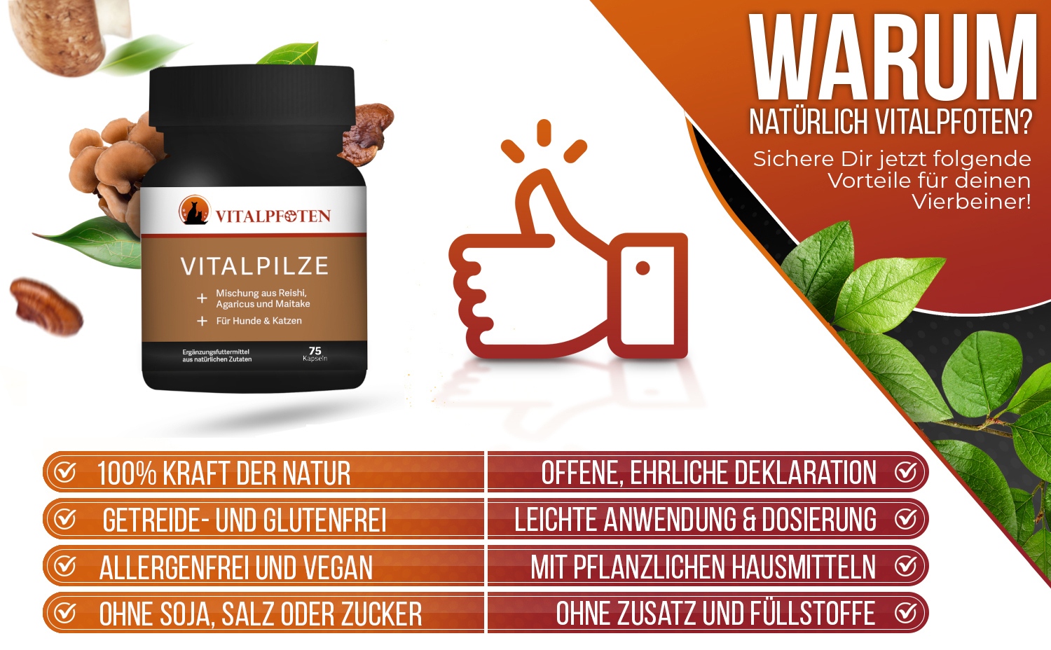 Bei unseren Vitalpfoten Vitalpilzen handelt es sich um ein rein natürliches Futterergänzungsmittel für Hunde und Katzen. Beachten Sie bitte, dass eine kurze Anwendung bei pflanzlichen Mitteln in den meisten Fällen nicht ausreicht.